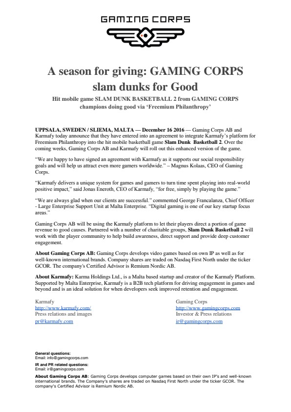 UPPSALA, SWEDEN / SLIEMA, MALTA – December 16 2016 – Gaming Corps AB and Karmafy today announce that they have entered into an agreement to integrate Karmafy’s platform for Freemium Philanthropy into the hit mobile basketball game Slam Dunk  Basketball 2. Over the coming weeks, Gaming Corps AB and Karmafy will roll out this enhanced version of the game.