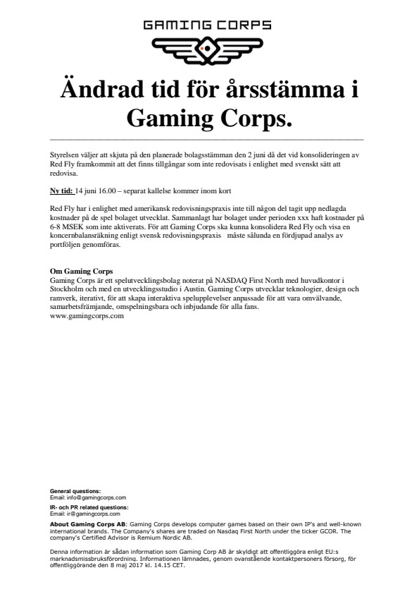 Ny tid för bolagsstämma 14 juni 16.00
