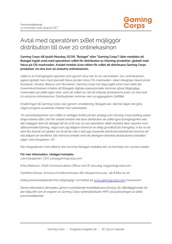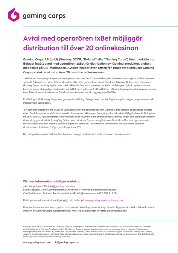 Gaming Corps AB (publ) (Nasdaq: GCOR, ”Bolaget” eller ”Gaming Corps”) låter meddela att Bolaget ingått avtal med operatören 1xBet för distribution av iGaming-produkter, globalt med fokus på CIS-marknaden. Avtalet innebär även rätten för 1xBet att distribuera Gaming Corps produkter via sina över 20 anslutna onlinekasinon.