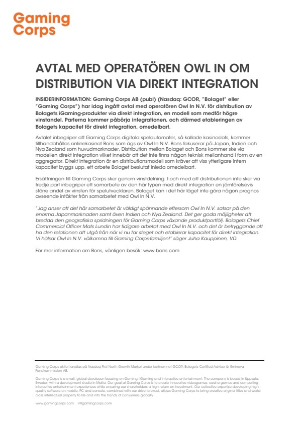 INSIDERINFORMATION: Gaming Corps AB (publ) (Nasdaq: GCOR, ”Bolaget” eller ”Gaming Corps”) har idag ingått avtal med operatören Owl In N.V. för distribution av Bolagets iGaming-produkter via direkt integration, en modell som medför högre vinstandel. Parterna kommer påbörja integrationen, och därmed etableringen av Bolagets kapacitet för direkt integration, omedelbart.