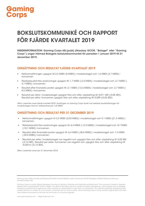 INSIDEINFORMATION: Gaming Corps AB (publ) (Nasdaq: GCOR, ”Bolaget” eller ”Gaming Corps”) avger härmed Bolagets bokslutskommuniké för perioden 1 januari 2019 till 31 december 2019.