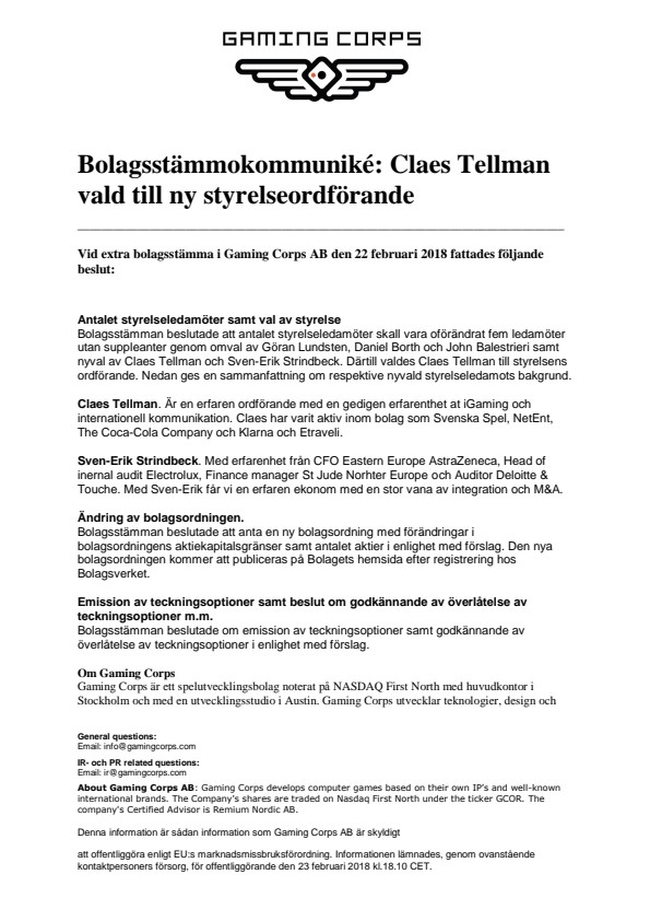 Vid extra bolagsstämma i Gaming Corps AB den 22 februari 2018 fattades följande beslut: