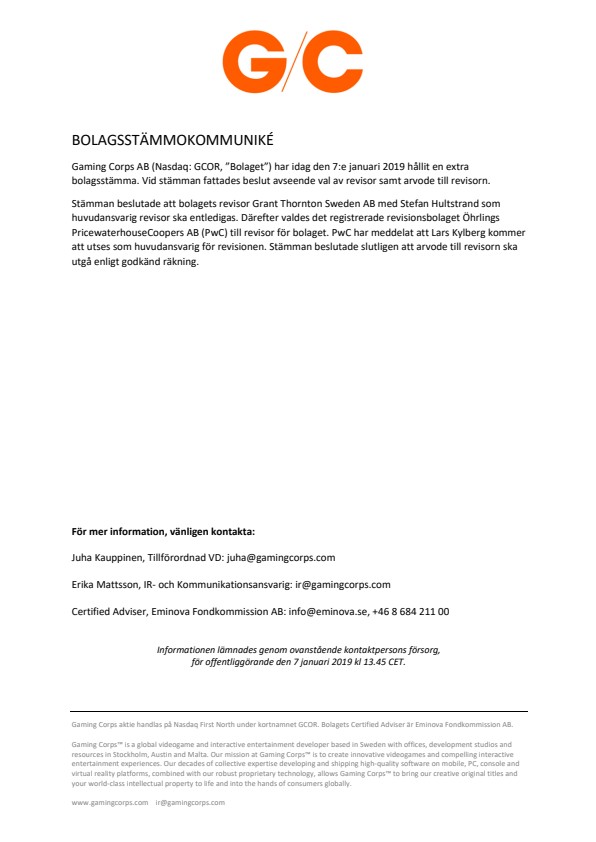 Gaming Corps AB (Nasdaq: GCOR, “Bolaget”) har idag den 7:e januari 2019 hållit en extra bolagsstämma. Vid stämman fattades beslut avseende val av revisor samt arvode till revisorn.