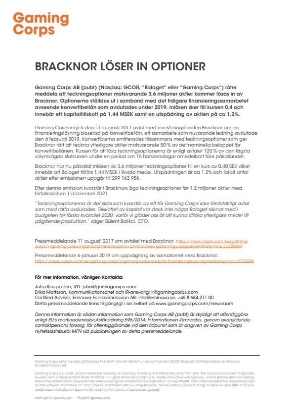 Gaming Corps AB (publ) (Nasdaq: GCOR, ”Bolaget” eller ”Gaming Corps”) låter meddela att teckningsoptioner motsvarande 3,6 miljoner aktier kommer lösas in av Bracknor. Optionerna ställdes ut i samband med det tidigare finansieringssamarbetet avseende konvertibellån som avslutades under 2019. Inlösen sker till kursen 0,4 och innebär ett kapitaltillskott på 1,44 MSEK samt en utspädning av aktien på ca 1,2%.