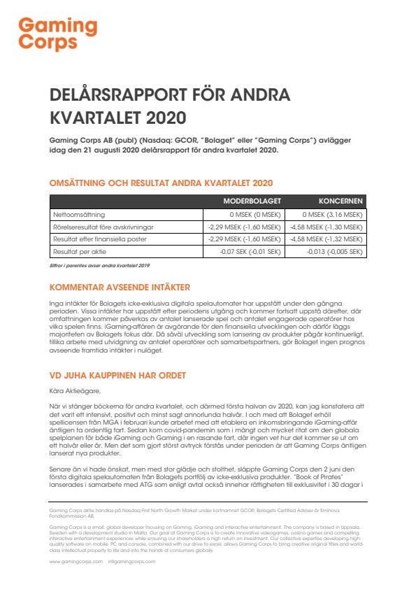 Gaming Corps AB (publ) (Nasdaq: GCOR, ”Bolaget” eller ”Gaming Corps”) avlägger idag den 21 augusti 2020 delårsrapport för andra kvartalet 2020.