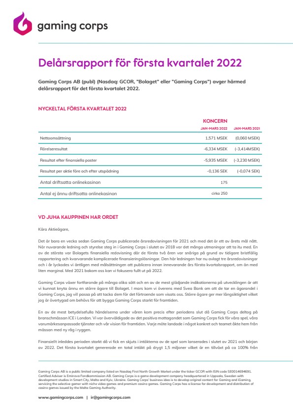 Gaming Corps AB (publ) (Nasdaq: GCOR, ”Bolaget” eller ”Gaming Corps”) avger härmed delårsrapport för det första kvartalet 2022.
