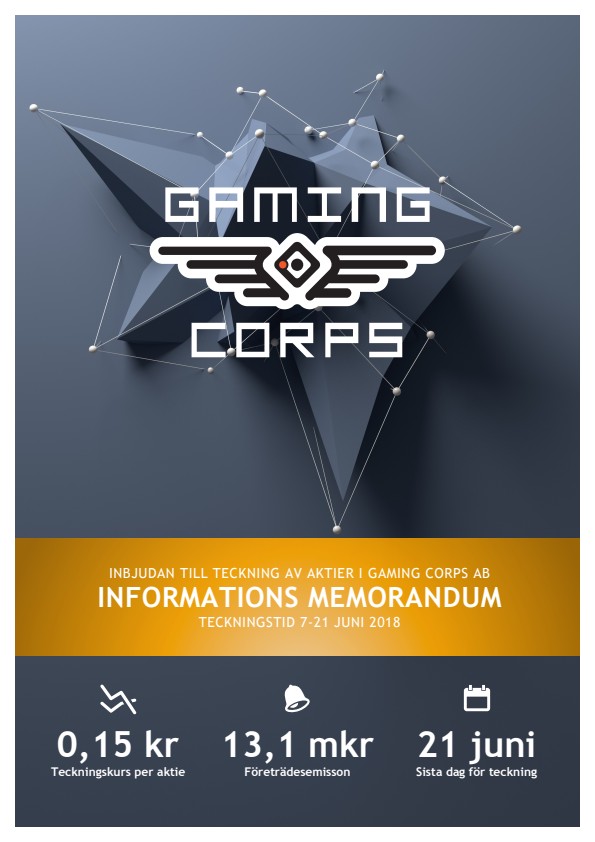 Det av styrelsen upprättade memorandumet finns bifogat pressmeddelandet, samt finns tillgängligt för nedladdning på www.gamingcorps.com/investors. Teaser samt anmälningssedel för teckning av aktier utan stöd av teckningsrätter kommer att finnas tillgängligt för nedladdning senast kl. 17 idag. Handlingarna kommer även att finnas tillgängliga för nedladdning från www.eminova.se.