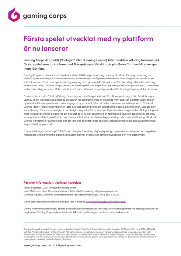 Gaming Corps investerade under tredje kvartalet 2020 i implementering av en ny plattform för programmering av digitala spelautomater, så kallade kasinoslots. Investeringen avsåg främst den del av utvecklingen som består av så kallad front end. En del av implementeringen avsåg även personal då ett nytt team för utveckling och kvalitetssäkring etablerades i Kiev, Ukraina. Idag lanseras det första spelet som tagits fram på den nya tekniska plattformen, i samarbete mellan utvecklingsteamen i Malta och Kiev, och sätter därmed en ny hög standard för Gaming Corps produkter framöver.