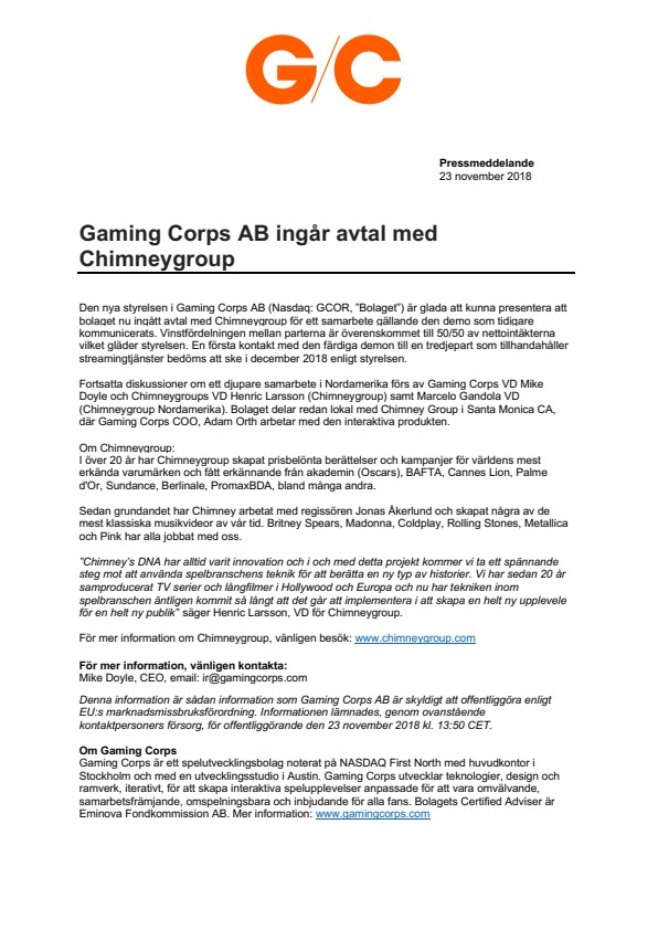 Den nya styrelsen i Gaming Corps AB (Nasdaq: GCOR, “Bolaget”) är glada att kunna presentera att bolaget nu ingått avtal med Chimneygroup för ett samarbete gällande den demo som tidigare kommunicerats. Vinstfördelningen mellan parterna är överenskommet till 50/50 av nettointäkterna vilket gläder styrelsen. En första kontakt med den färdiga demon till en tredjepart som tillhandahåller streamingtjänster bedöms att ske i december 2018 enligt styrelsen.
