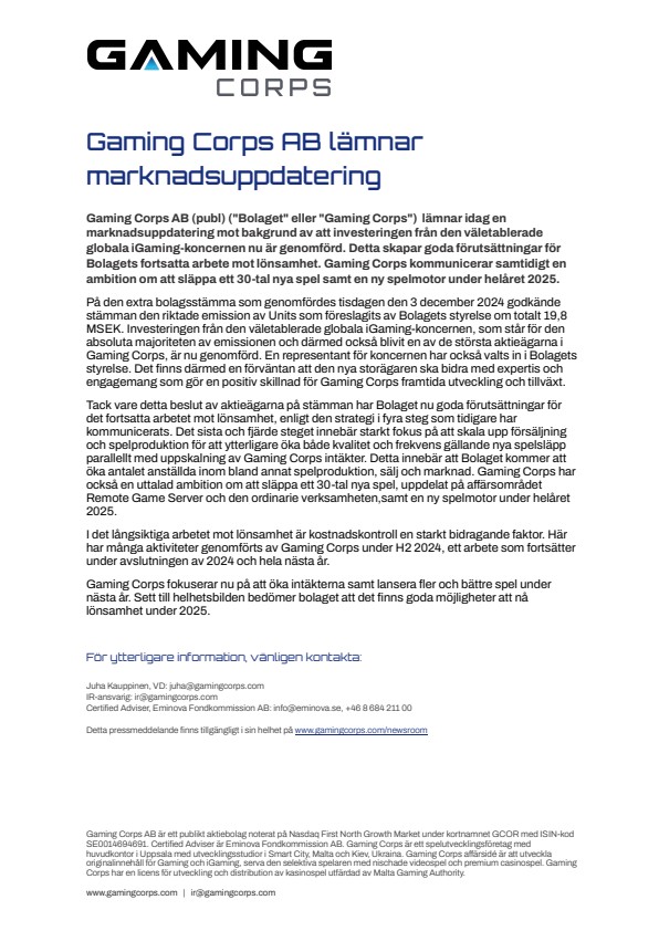 Gaming Corps AB (publ) (“Bolaget” eller “Gaming Corps”) lämnar idag en marknadsuppdatering mot bakgrund av att investeringen från den väletablerade globala iGaming-koncernen nu är genomförd. Detta skapar goda förutsättningar för Bolagets fortsatta arbete mot lönsamhet. Gaming Corps kommunicerar samtidigt en ambition om att släppa ett 30-tal nya spel samt en ny spelmotor under helåret 2025.