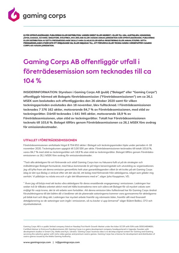 INSIDERINFORMATION: Styrelsen i Gaming Corps AB (publ) (“Bolaget” eller “Gaming Corps”) offentliggör härmed att Bolagets företrädesemission (”Företrädesemissionen”) om ca 26,1 MSEK som beslutades och offentliggjordes den 26 oktober 2020 samt för vilken teckningsperioden avslutades den 18 november, blev fulltecknad. I Företrädesemissionen tecknades 7 376 162 aktier, motsvarande 84,7 % av Företrädesemissionen, med stöd av teckningsrätter. Därtill tecknades 1 641 945 aktier, motsvarande 18,9 % av Företrädesemissionen, utan stöd av teckningsrätter. Totalt har Företrädesemissionen tecknats till 103,6 %. Bolaget tillförs genom Företrädesemissionen ca 26,1 MSEK före avdrag för emissionskostnader.