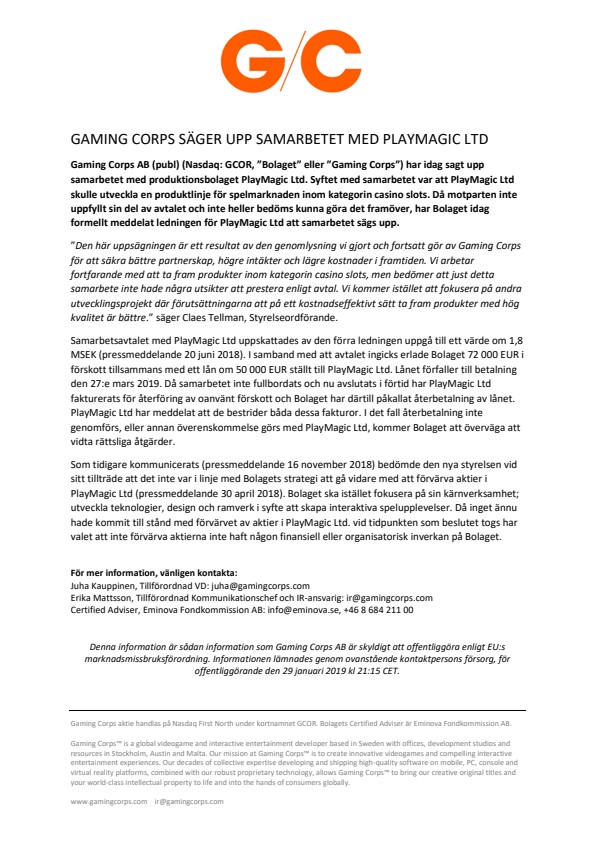 Gaming Corps AB (publ) (Nasdaq: GCOR, “Bolaget” eller “Gaming Corps”) har idag sagt upp samarbetet med produktionsbolaget PlayMagic Ltd. Syftet med samarbetet var att PlayMagic Ltd skulle utveckla en produktlinje för spelmarknaden inom kategorin casino slots. Då motparten inte uppfyllt sin del av avtalet och inte heller bedöms kunna göra det framöver, har Bolaget idag formellt meddelat ledningen för PlayMagic Ltd att samarbetet sägs upp.