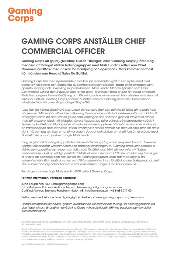 Gaming Corps AB (publ) (Nasdaq: GCOR, ”Bolaget” eller ”Gaming Corps”) låter idag meddela att Bolaget utökar ledningsgruppen med Mats Lundin i rollen som Chief Commercial Officer med ansvar för försäljning och operations. Mats kommer närmast från tjänsten som Head of Sales för iSoftBet.