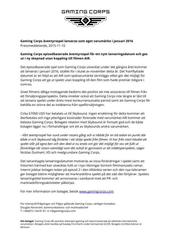 Cirka 67000 USD har betalats ut till Skybound. Ingen ersättning för detta kommer att återbetalas och inga ytterligare kostnader förenade med varumärket AIR kommer att belasta Gaming Corps. Bolagets relation med Skybound är fortsatt god och de båda bolagen ligger nu i förhandlingar om ett av Skybounds andra varumärken.