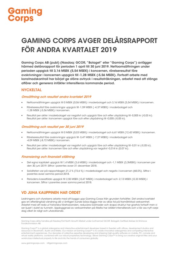 Gaming Corps AB (publ) (Nasdaq: GCOR, ”Bolaget” eller ”Gaming Corps”) avlägger härmed delårsrapport för perioden 1 april till 30 juni 2019. Nettoomsättningen under perioden uppgick till 3,16 MSEK (5,54 MSEK) i koncernen, rörelseresultat före avskrivningar i koncernen uppgick till -1,28 MSEK (-5,56 MSEK). Fortsatt arbete med konstnadskontroll har börjat ge större avtryck i resultaträkningen, arbetet med att stänga affärer och generera intäkter intensifieras kommande period.