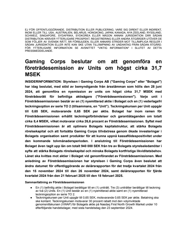 INSIDERINFORMATION: Styrelsen i Gaming Corps AB (“Gaming Corps” eller “Bolaget”) har idag beslutat, med stöd av bemyndigande från årsstämman som hölls den 28 juni 2024, att genomföra en nyemission av units om högst cirka 31,7 MSEK med företrädesrätt för befintliga aktieägare (“Företrädesemissionen”). Varje unit i Företrädesemissionen består av en (1) nyemitterad aktie i Bolaget och en (1) vederlagsfri teckningsoption av serie TO 2 (tillsammans, en ”Unit”). Teckningskursen per Unit uppgår till 0,65 SEK, motsvarande 0,65 SEK per aktie. Bolaget har inom ramen för Företrädesemissionen erhållit teckningsförbindelser och garantiåtaganden om totalt cirka 8,4 MSEK, vilket motsvarar cirka 26,6 procent av Företrädesemissionen. Syftet med Företrädesemissionen är att optimera Bolagets kapitalstruktur, att stärka Bolagets rörelsekapital och att fortsätta Gaming Corps tillväxtresa genom ökade investeringar i Bolagets organisation samt produkter för att kunna uppnå kassaflödespositivitet under den kommande tolvmånadersperioden. I anslutning till Företrädesemissionen har Bolaget även tagit upp lån om totalt 940 000 SEK från tre av Bolagets styrelseledamöter i syfte att stärka Bolagets rörelsekapital och minska Bolagets kortfristiga likviditetsbehov. Lånet ska kvittas mot aktier i Bolaget vid genomförandet av Företrädesemissionen. Med anledning av Företrädesemissionen har styrelsen i Gaming Corps även beslutat att ändra datumet för offentliggörande av delårsrapporten för det tredje kvartalet 2024 från den 15 november 2024 till den 26 november 2024, samt delårsrapporten för fjärde kvartalet 2024 från den 21 februari 2025 till den 18 februari 2025.