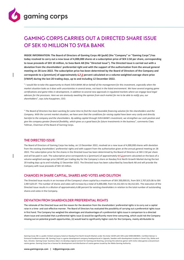 INSIDE INFORMATION: The Board of Directors of Gaming Corps AB (publ) (the “Company” or “Gaming Corps”) has today resolved to carry out a new issue of 4,000,000 shares at a subscription price of SEK 2.50 per share, corresponding to issue proceeds of SEK 10 million, to Svea Bank AB (the “Directed Issue”). The Directed Issue is carried out with a deviation from the shareholders’ preferential right and with the support of the authorization from the annual general meeting on 28 June 2022. The subscription price has been determined by the Board of Directors of the Company and corresponds to a [premium] of approximately 7,8 percent calculated on a volume-weighted average share price (VWAP) during the last 20 trading days, up to and including 12 December 2022.