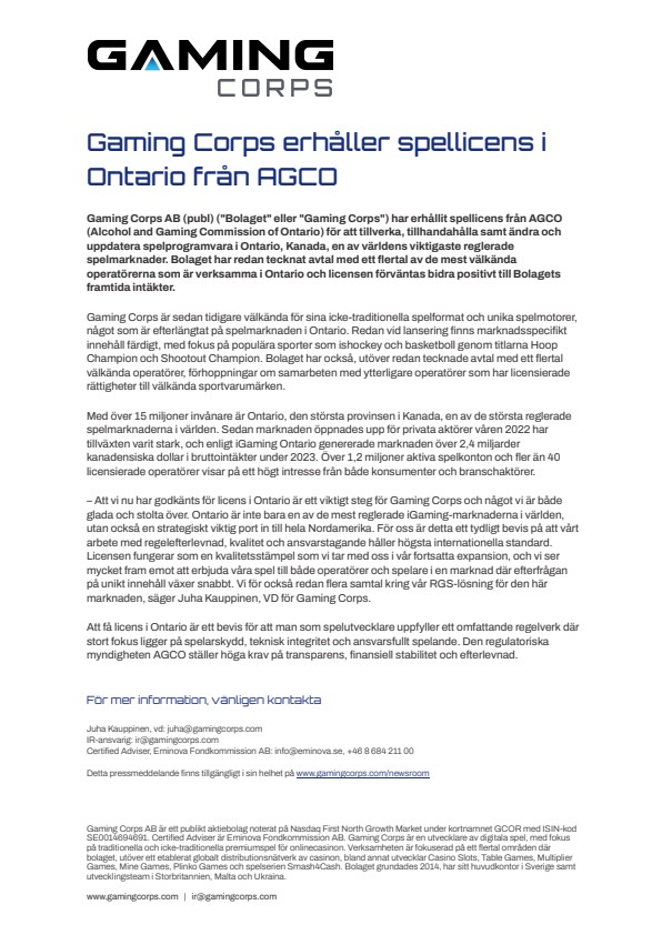 Gaming Corps AB (publ) (“Bolaget” eller “Gaming Corps”) har erhållit spellicens från AGCO (Alcohol and Gaming Commission of Ontario) för att tillverka, tillhandahålla samt ändra och uppdatera spelprogramvara i Ontario, Kanada, en av världens viktigaste reglerade spelmarknader. Bolaget har redan tecknat avtal med ett flertal av de mest välkända operatörerna som är verksamma i Ontario och licensen förväntas bidra positivt till Bolagets framtida intäkter.