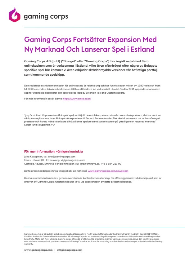 Gaming Corps AB (publ) (“Bolaget” eller “Gaming Corps”) har ingått avtal med flera onlinekasinon som är verksamma i Estland; vilka även efterfrågat efter några av Bolagets specifika spel här kommer vi även erbjuder skräddarsydda versioner vår befintliga portfölj samt kommande spelsläpp.