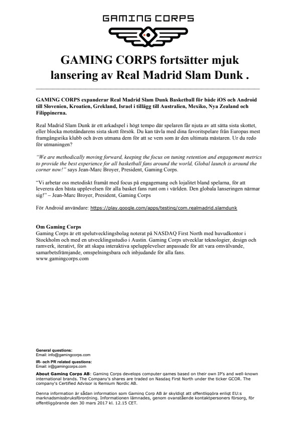 GAMING CORPS expanderar Real Madrid Slam Dunk Basketball för både iOS och Android till Slovenien, Kroatien, Grekland, Israel i tillägg till Australien, Mexiko, Nya Zealand och Filippinerna.