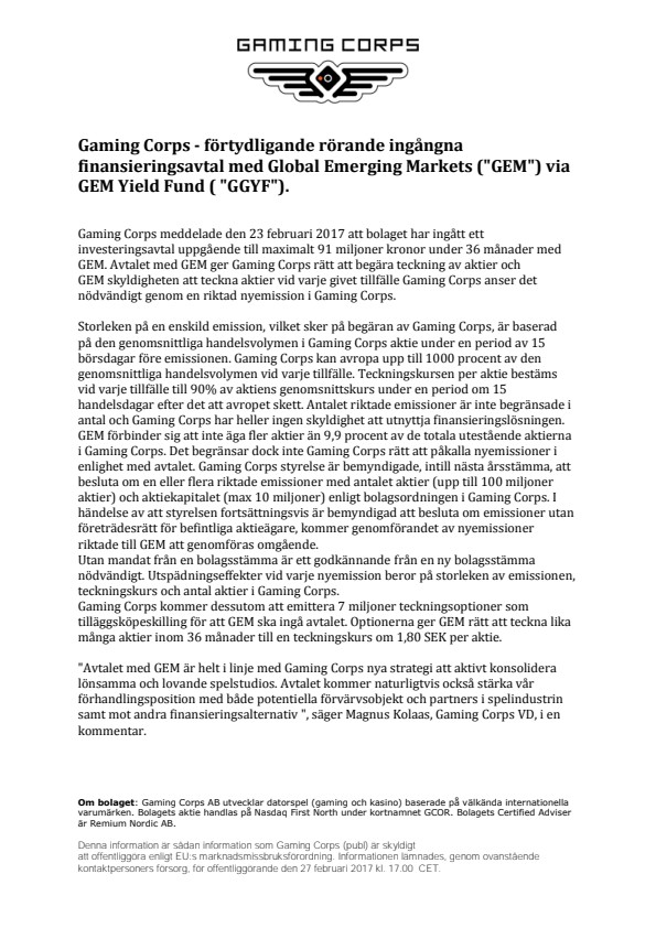 GEM förbinder sig att inte äga fler aktier än 9,9 procent av de totala utestående aktierna i Gaming Corps. Det begränsar dock inte Gaming Corps rätt att påkalla nyemissioner i enlighet med avtalet. Gaming Corps styrelse är bemyndigade, intill nästa årsstämma, att besluta om en eller flera riktade emissioner med antalet aktier (upp till 100 miljoner aktier) och aktiekapitalet (max 10 miljoner) enligt bolagsordningen i Gaming Corps. I händelse av att styrelsen fortsättningsvis är bemyndigad att besluta om emissioner utan företrädesrätt för befintliga aktieägare, kommer genomförandet av nyemissioner riktade till GEM att genomföras omgående.
