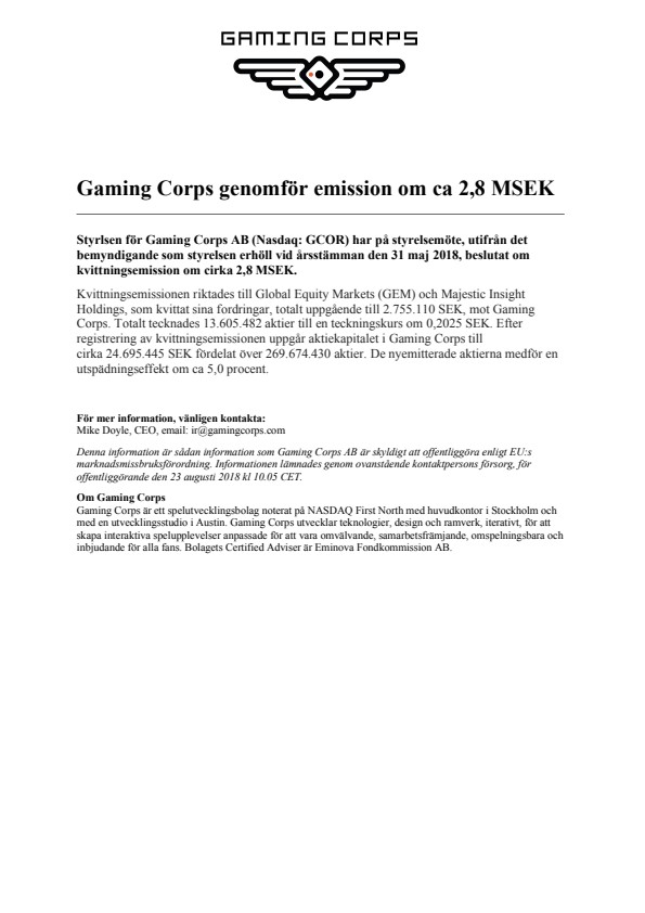 Denna information är sådan information som Gaming Corps AB är skyldigt att offentliggöra enligt EU:s marknadsmissbruksförordning. Informationen lämnades genom ovanstående kontaktpersons försorg, för offentliggörande den 23 augusti 2018 kl 10.05 CET.