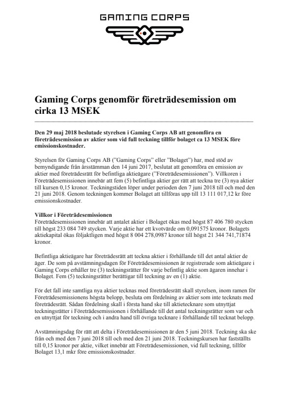 Styrelsen för Gaming Corps AB (“Gaming Corps” eller “Bolaget”) har, med stöd av bemyndigande från årsstämman den 14 juni 2017, beslutat att genomföra en emission av aktier med företrädesrätt för befintliga aktieägare (“Företrädesemissionen”). Villkoren i Företrädesemissionen innebär att fem (5) befintliga aktier ger rätt att teckna tre (3) nya aktier till kursen 0,15 kronor. Teckningstiden löper under perioden den 7 juni 2018 till och med den 21 juni 2018. Genom teckningen kommer Bolaget att tillföras upp till 13 111 017,12 kr före emissionskostnader.