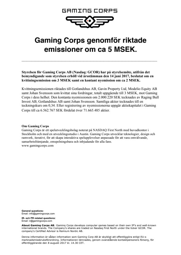 Kvittningsemissionen riktades till Gotlandshus AB, Gavin Property Ltd, Modelio Equity AB samt Johan Svensson som kvittat sina fordringar, totalt uppgående till 3 MSEK, mot Gaming Corps i dess helhet. Den kontanta nyemissionen om 2.000.220 SEK tecknades av Raging Bull Invest AB, Gotlandshus AB samt Johan Svensson. Samtliga aktier tecknades till en teckningskurs om 0,34. Efter registrering av nyemissionerna uppgår aktiekapitalet i Gaming Corps till ca 6.562.767 SEK fördelat över 71.665.485 aktier.
