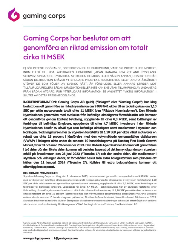 INSIDERINFORMATION: Gaming Corps AB (publ) (“Bolaget” eller “Gaming Corps”) har idag beslutat om att genomföra en riktad nyemission om 9 989 541 aktier till en teckningskurs om 1,10 SEK per aktie motsvarande totalt cirka 11 MSEK (den “Riktade Nyemissionen”). Den Riktade Nyemissionen genomförs med avvikelse från befintliga aktieägares företrädesrätt och kommer att genomföras genom kontant betalning, uppgående till cirka 6,3 MSEK, samt kvittningar av fordringar till befintliga långivare, uppgående till cirka 4,7 MSEK. Investerare i den Riktade Nyemissionen består av såväl nya som befintliga aktieägare samt medlemmar i styrelsen och ledningen. Teckningskursen har av styrelsen fastställts till 1,10 SEK per aktie vilket motsvarar en rabatt om cirka 19 procent i jämförelse med den volymviktade genomsnittliga aktiekursen (VWAP) i Bolagets aktie under de senaste 10 handelsdagarna på Nasdaq First North Growth Market, fram till och med 20 december 2023. Den Riktade Nyemissionen kommer att genomföras i två delar där den första delen kommer att beslutas baserat på det bemyndigande som styrelsen erhöll på årsstämman den 26 juni 2023 (“Tranche 1”) och den andra delen, där medlemmar i styrelsen och ledningen deltar, är förbehållet beslut från extra bolagsstämma som planeras att hållas den 11 januari 2024 (“Tranche 2”). Kallelse till extra bolagsstämma kommer att offentliggöras separat.