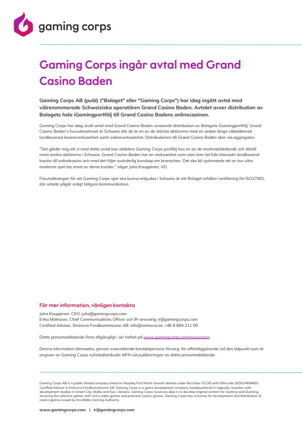 Gaming Corps AB (publ) (“Bolaget” eller “Gaming Corps”) har idag ingått avtal med välrenommerade Schweiziska operatören Grand Casino Baden. Avtalet avser distribution av Bolagets hela iGamingportfölj till Grand Casino Badens onlinecasinon.