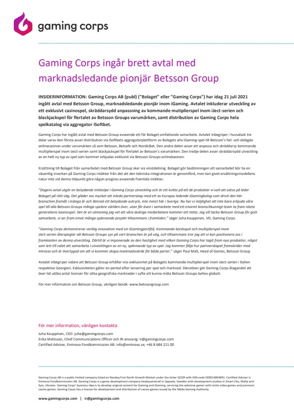 INSIDERINFORMATION: Gaming Corps AB (publ) (“Bolaget” eller “Gaming Corps”) har idag 21 juli 2021 ingått avtal med Betsson Group, marknadsledande pionjär inom iGaming. Avtalet inkluderar utveckling av ett exklusivt casinospel, skräddarsydd anpassning av kommande mutiplierspel inom iJect-serien och blackjackspel för flertalet av Betsson Groups varumärken, samt distribution av Gaming Corps hela spelkatalog via aggregator iSoftbet.