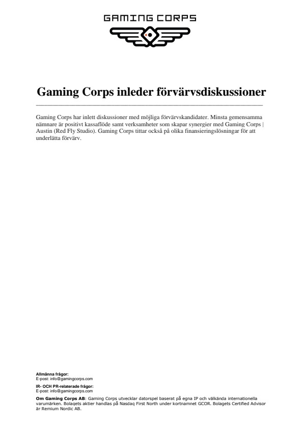 Gaming Corps har inlett diskussioner med möjliga förvärvskandidater. Minsta gemensamma nämnare är positivt kassaflöde samt verksamheter som skapar synergier med Gaming Corps | Austin (Red Fly Studio). Gaming Corps tittar också på olika finansieringslösningar för att underlätta förvärv.