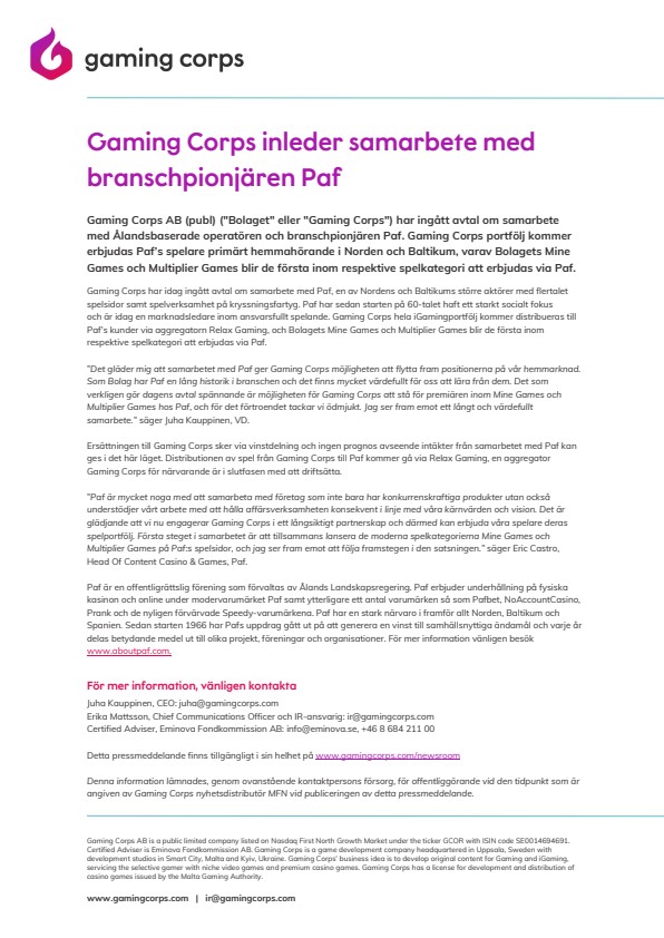 Gaming Corps AB (publ) (“Bolaget” eller “Gaming Corps”) har ingått avtal om samarbete med Ålandsbaserade operatören och branschpionjären Paf. Gaming Corps portfölj kommer erbjudas Paf’s spelare primärt hemmahörande i Norden och Baltikum, varav Bolagets Mine Games och Multiplier Games blir de första inom respektive spelkategori att erbjudas via Paf.