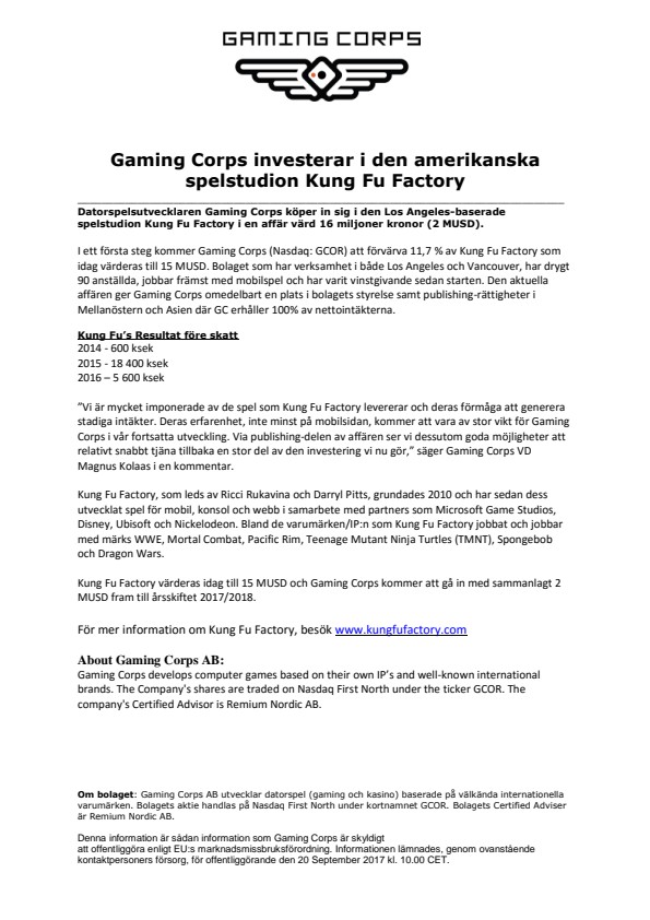 Kung Fu Factory värderas idag till 15 MUSD och Gaming Corps kommer att gå in med sammanlagt 2 MUSD fram till årsskiftet 2017/2018.