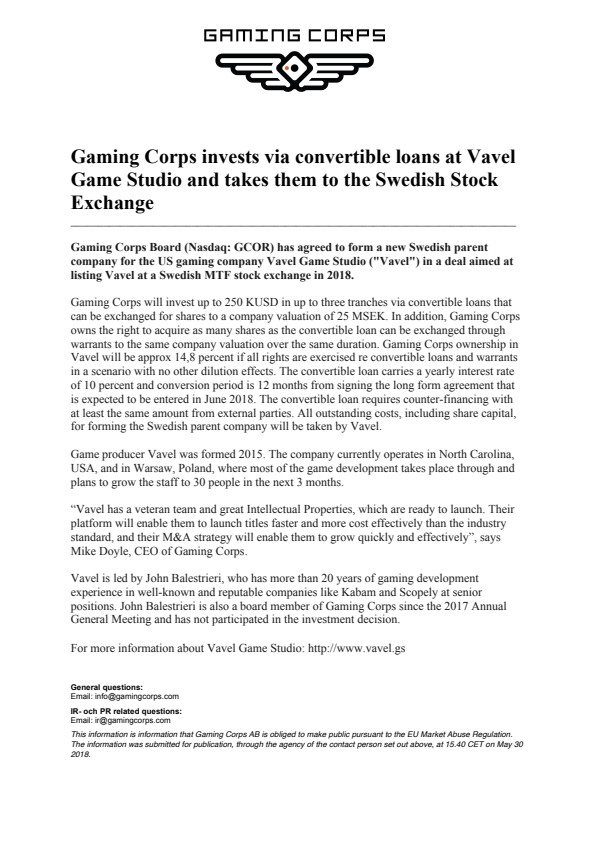 This information is information that Gaming Corps AB is obliged to make public pursuant to the EU Market Abuse Regulation. The information was submitted for publication, through the agency of the contact person set out above, at 15.40 CET on May 30 2018.