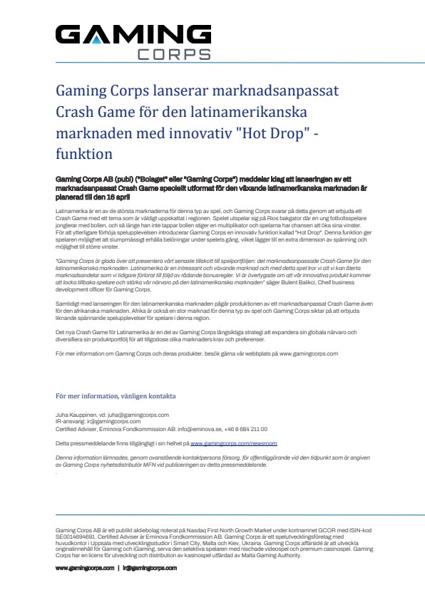 Gaming Corps AB (publ) (“Bolaget” eller “Gaming Corps”) meddelar idag att lanseringen av ett marknadsanpassat Crash Game speciellt utformat för den växande latinamerikanska marknaden är planerad till den 16 april