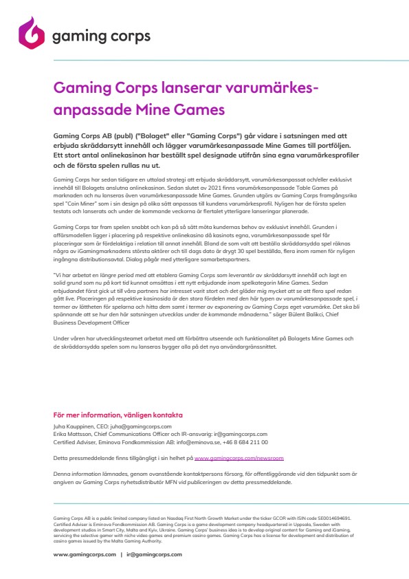 Gaming Corps har sedan tidigare en uttalad strategi att erbjuda skräddarsytt, varumärkesanpassat och/eller exklusivt innehåll till Bolagets anslutna onlinekasinon. Sedan slutet av 2021 finns varumärkesanpassade Table Games på marknaden och nu lanseras även varumärkesanpassade Mine Games. Grunden utgörs av Gaming Corps framgångsrika spel ”Coin Miner” som i sin design på olika sätt anpassas till kundens varumärkesprofil. Nyligen har de första spelen testats och lanserats och under de kommande veckorna är flertalet ytterligare lanseringar planerade.