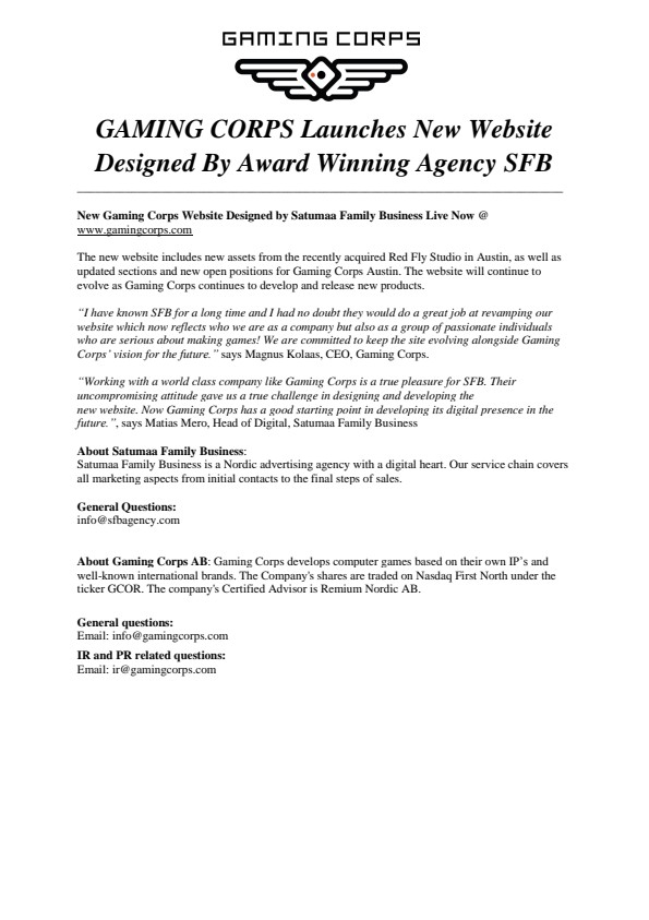 “I have known SFB for a long time and I had no doubt they would do a great job at revamping our website which now reflects who we are as a company but also as a group of passionate individuals who are serious about making games! We are committed to keep the site evolving alongside Gaming Corps’ vision for the future.” says Magnus Kolaas, CEO, Gaming Corps.