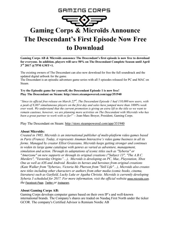 “Since its official free release on March 22nd, The Descendant Episode 1 had 110,000 new users, with a peak of 8,807 simultaneous players on the first day and sales have jumped more than 1000% week over week. We understand that the current promotion is giving an extra lift to the title so we want to remain cautious, however, we are planning more activities on The Descendant with Microïds who has been a great partner to work with so far!” – Jean-Marc Broyer, President, Gaming Corps.