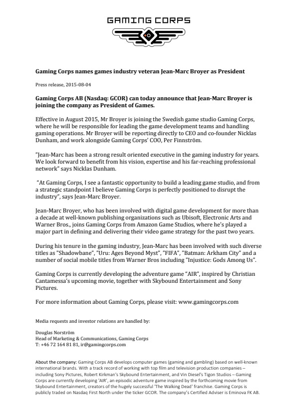 Effective in August 2015, Mr Broyer is joining the Swedish game studio Gaming Corps, where he will be responsible for leading the game development teams and handling gaming operations. Mr Broyer will be reporting directly to CEO and co-founder Nicklas Dunham, and work alongside Gaming Corps’ COO, Per Finnström.