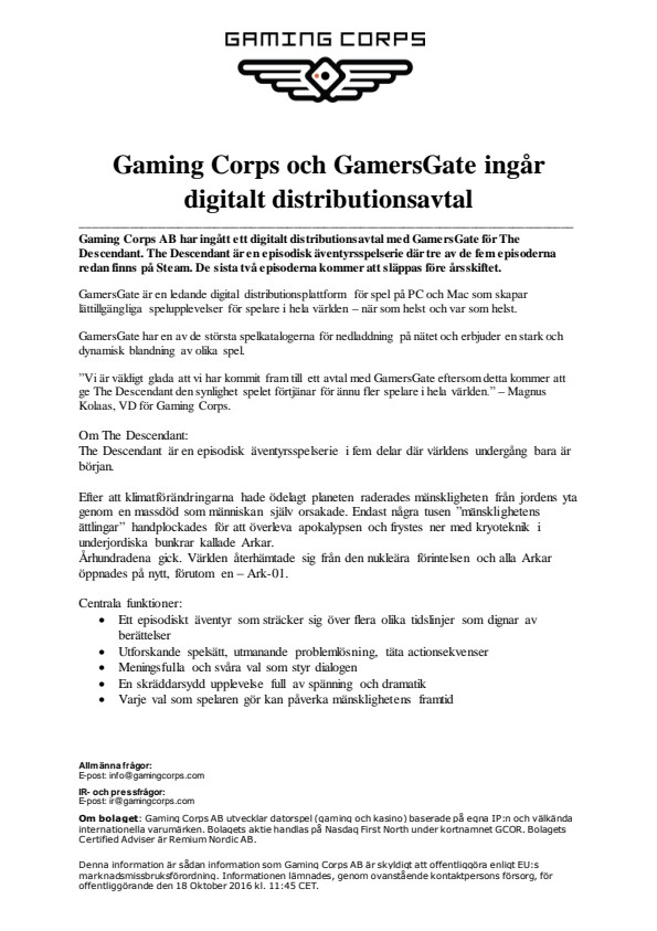 “Vi är väldigt glada att vi har kommit fram till ett avtal med GamersGate eftersom detta kommer att ge The Descendant den synlighet spelet förtjänar för ännu fler spelare i hela världen.” – Magnus Kolaas, VD för Gaming Corps.