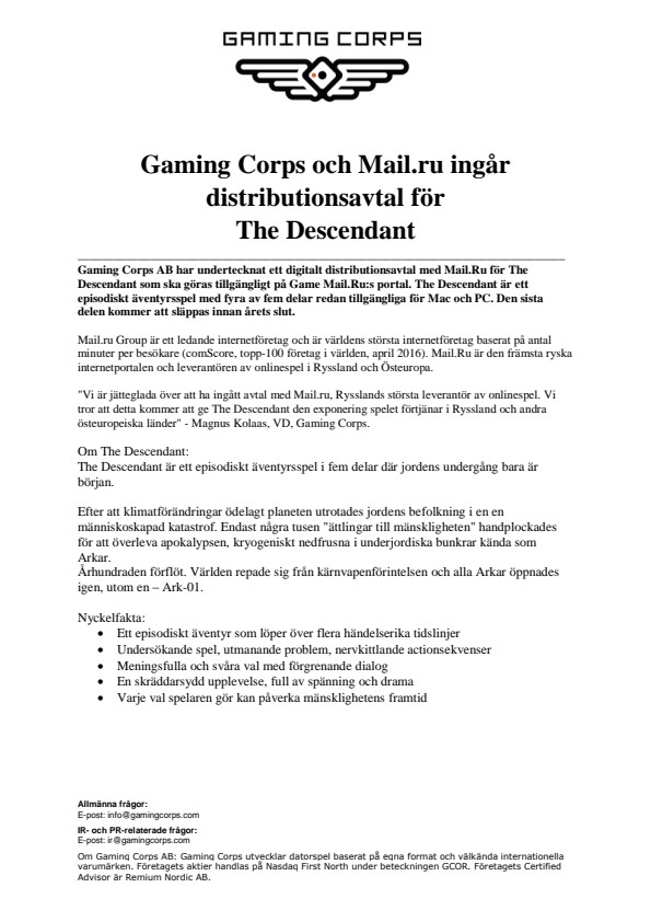 “Vi är jätteglada över att ha ingått avtal med Mail.ru, Rysslands största leverantör av onlinespel. Vi tror att detta kommer att ge The Descendant den exponering spelet förtjänar i Ryssland och andra östeuropeiska länder” – Magnus Kolaas, VD, Gaming Corps.