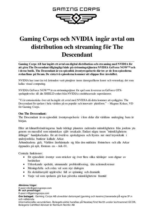 “Vi är entusiastiska över att ha ingått ett avtal med NVIDIA då detta kommer att synliggöra The Descendant för spelare i hela världen på en populär och innovativ plattform.” – Magnus Kolaas, VD för Gaming Corps.