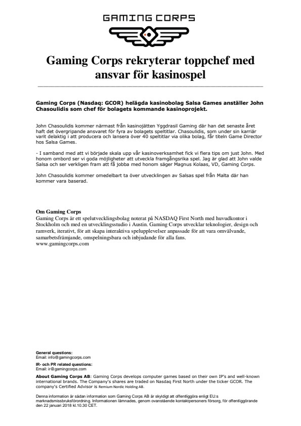 Gaming Corps (Nasdaq: GCOR) helägda kasinobolag Salsa Games anställer John Chasoulidis som chef för bolagets kommande kasinoprojekt.