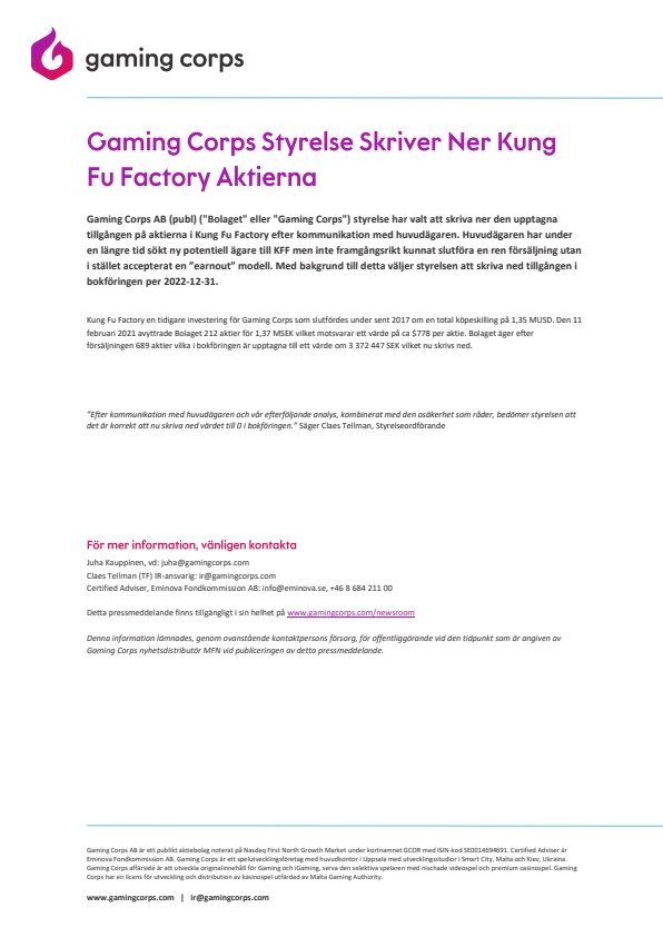 Gaming Corps AB (publ) (“Bolaget” eller “Gaming Corps”) styrelse har valt att skriva ner den upptagna tillgången på aktierna i Kung Fu Factory efter kommunikation med huvudägaren. Huvudägaren har under en längre tid sökt ny potentiell ägare till KFF men inte framgångsrikt kunnat slutföra en ren försäljning utan i stället accepterat en ”earnout” modell. Med bakgrund till detta väljer styrelsen att skriva ned tillgången i bokföringen per 2022-12-31.