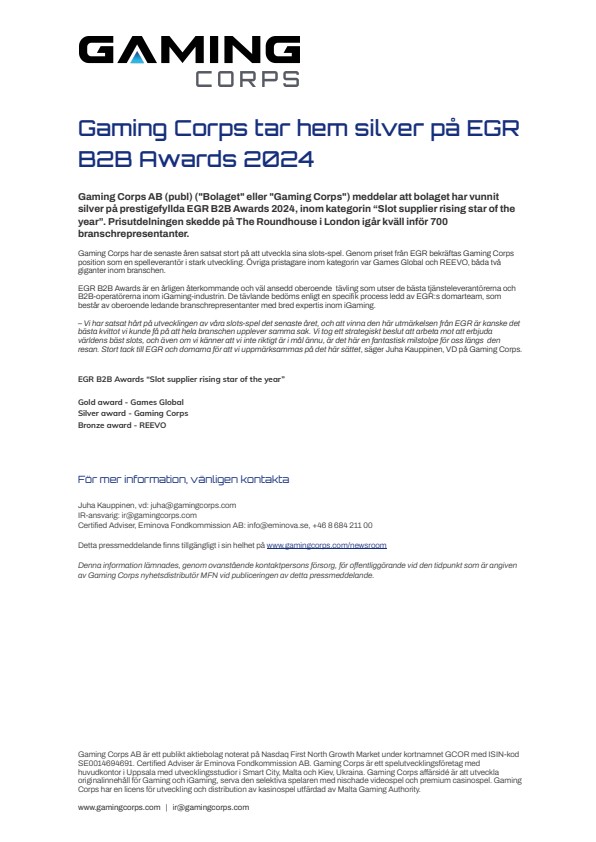 Gaming Corps AB (publ) (“Bolaget” eller “Gaming Corps”) meddelar att bolaget har vunnit silver på prestigefyllda EGR B2B Awards 2024, inom kategorin “Slot supplier rising star of the year”. Prisutdelningen skedde på The Roundhouse i London igår kväll inför 700 branschrepresentanter.