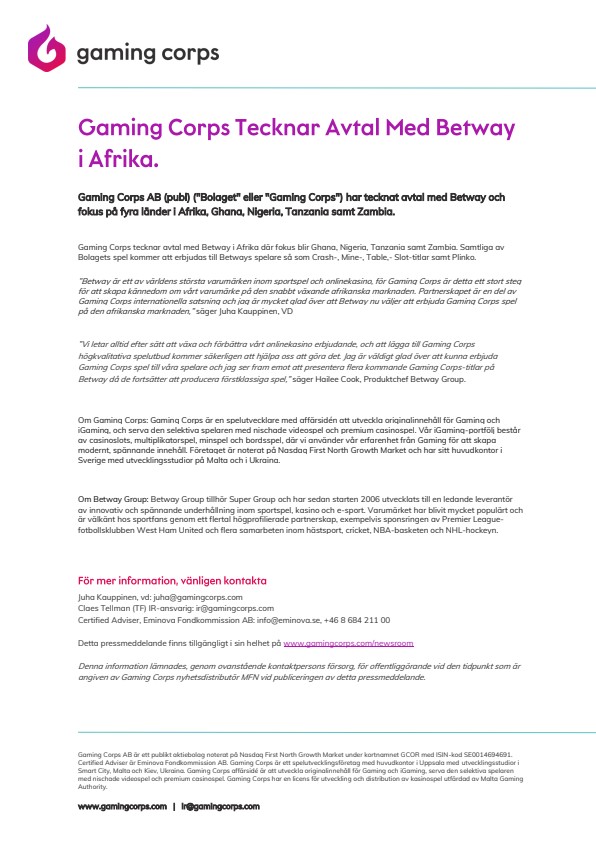 Gaming Corps tecknar avtal med Betway i Afrika där fokus blir Ghana, Nigeria, Tanzania samt Zambia. Samtliga av Bolagets spel kommer att erbjudas till Betways spelare så som Crash-, Mine-, Table,- Slot-titlar samt Plinko.