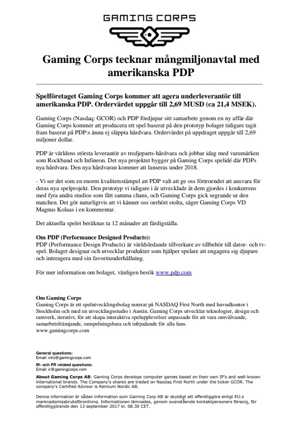 Gaming Corps (Nasdaq: GCOR) och PDP fördjupar sitt samarbete genom en ny affär där Gaming Corps kommer att producera ett spel baserat på den prototyp bolaget tidigare tagit fram baserat på PDP:s ännu ej släppta hårdvara. Ordervärdet på uppdraget uppgår till 2,69 miljoner dollar.