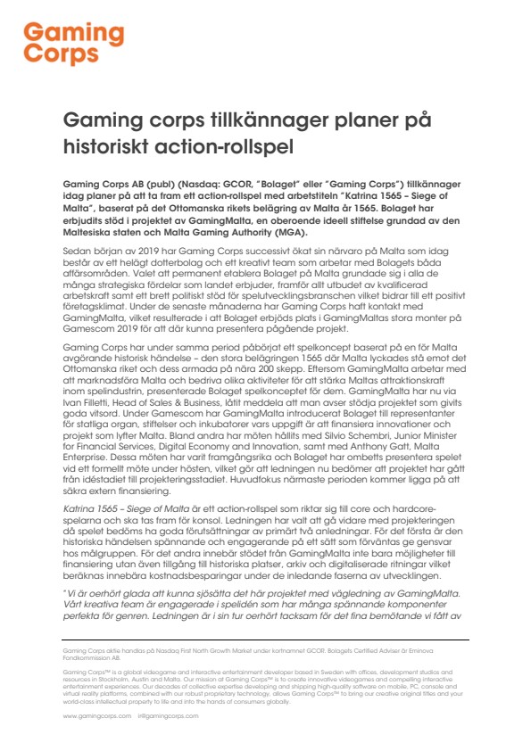 Gaming Corps AB (publ) (Nasdaq: GCOR, ”Bolaget” eller ”Gaming Corps”) tillkännager idag planer på att ta fram ett action-rollspel med arbetstiteln ”Katrina 1565 – Siege of Malta”, baserat på det Ottomanska rikets belägring av Malta år 1565. Bolaget har erbjudits stöd i projektet av GamingMalta, en oberoende ideell stiftelse grundad av den Maltesiska staten och Malta Gaming Authority (MGA).