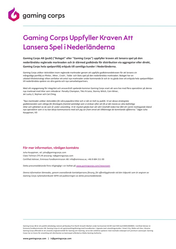 Gaming Corps AB (publ) (“Bolaget” eller “Gaming Corps”) uppfyller kraven att lansera spel på den nederländska reglerade marknaden och är därmed godkända för distribution via aggregator eller direkt, Gaming Corps hela spelportfölj erbjuds till samtliga kunder i Nederländerna.